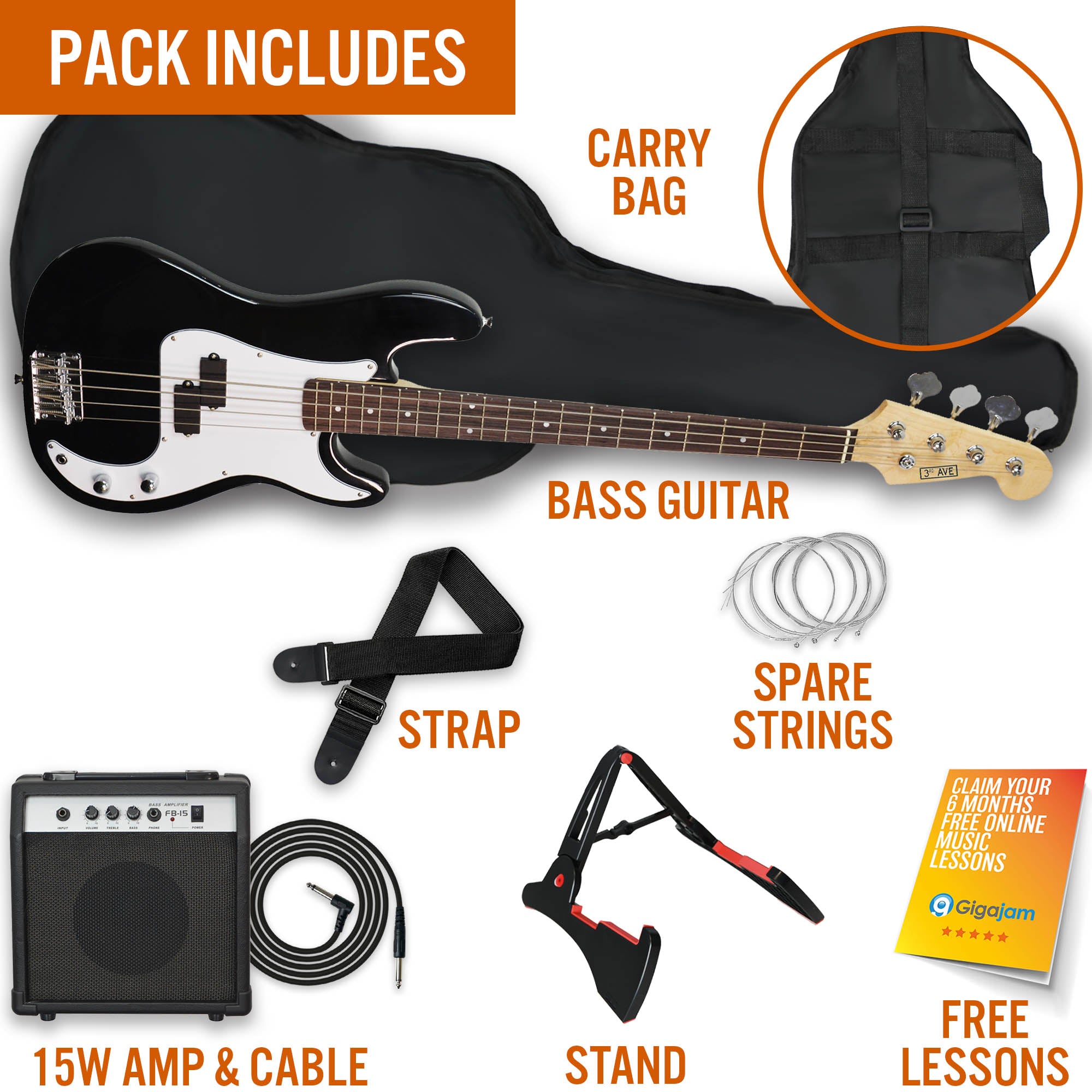 The 3rd Avenue Bass Guitar boasts an iconic P-Style design and versatility for all music genres. It features a glossy black finish with a white PVC scratch plate and covered pickups for a sleek modern look. The pack includes a 15-watt amplifier ideal for both bedroom practice and performance, with a headphone socket for silent rehearsals. Essential accessories like a gig bag, cable, strap, extra strings, and stand are also included for easy transport, storage, and playing.
