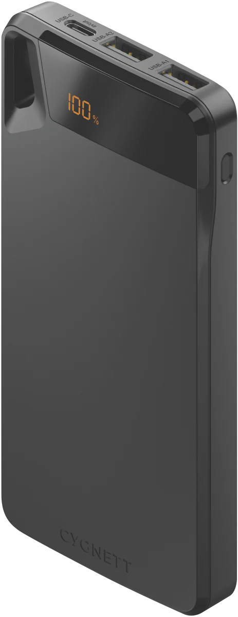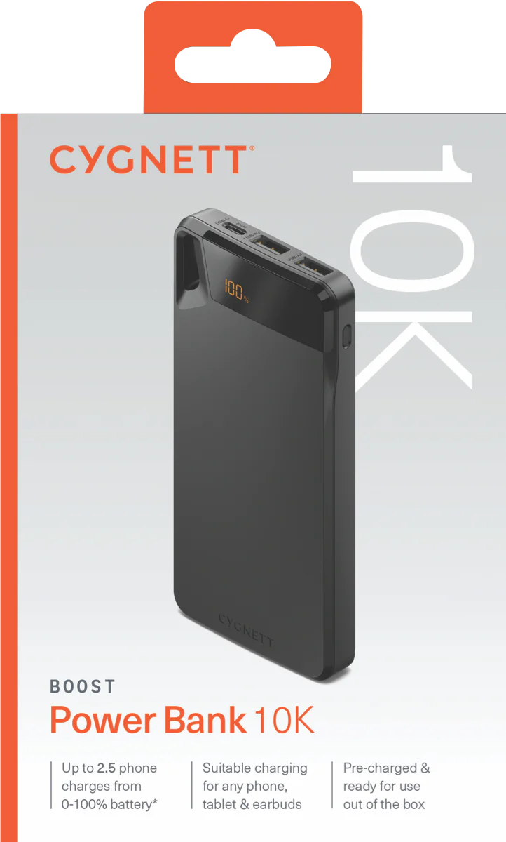 Stay powered wherever you go with the Cygnett Boost Power Bank 10K 4th Gen in sleek black. With a high-capacity 10,000 mAh battery, this compact and lightweight charger gives you up to approximately 2.6 full phone recharges. It features a triple-port layout—1 × USB-C and 2 × USB-A—so you can charge up to three devices simultaneously. The included USB-C cable and digital charge-percentage display ensure you know exactly when it’s time to recharge. With a pocket-friendly profile (approx. 145 mm × 71 mm × 17 mm) and rugged design, it’s ideal for travel, work or daily use. Pre-charged and ready out of the box, this power bank delivers reliable performance and everyday convenience.