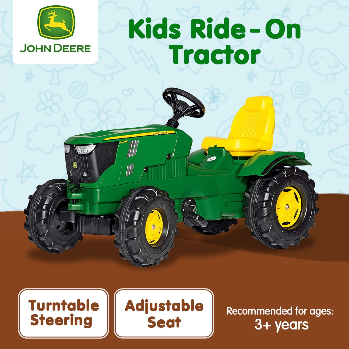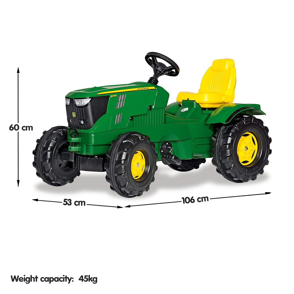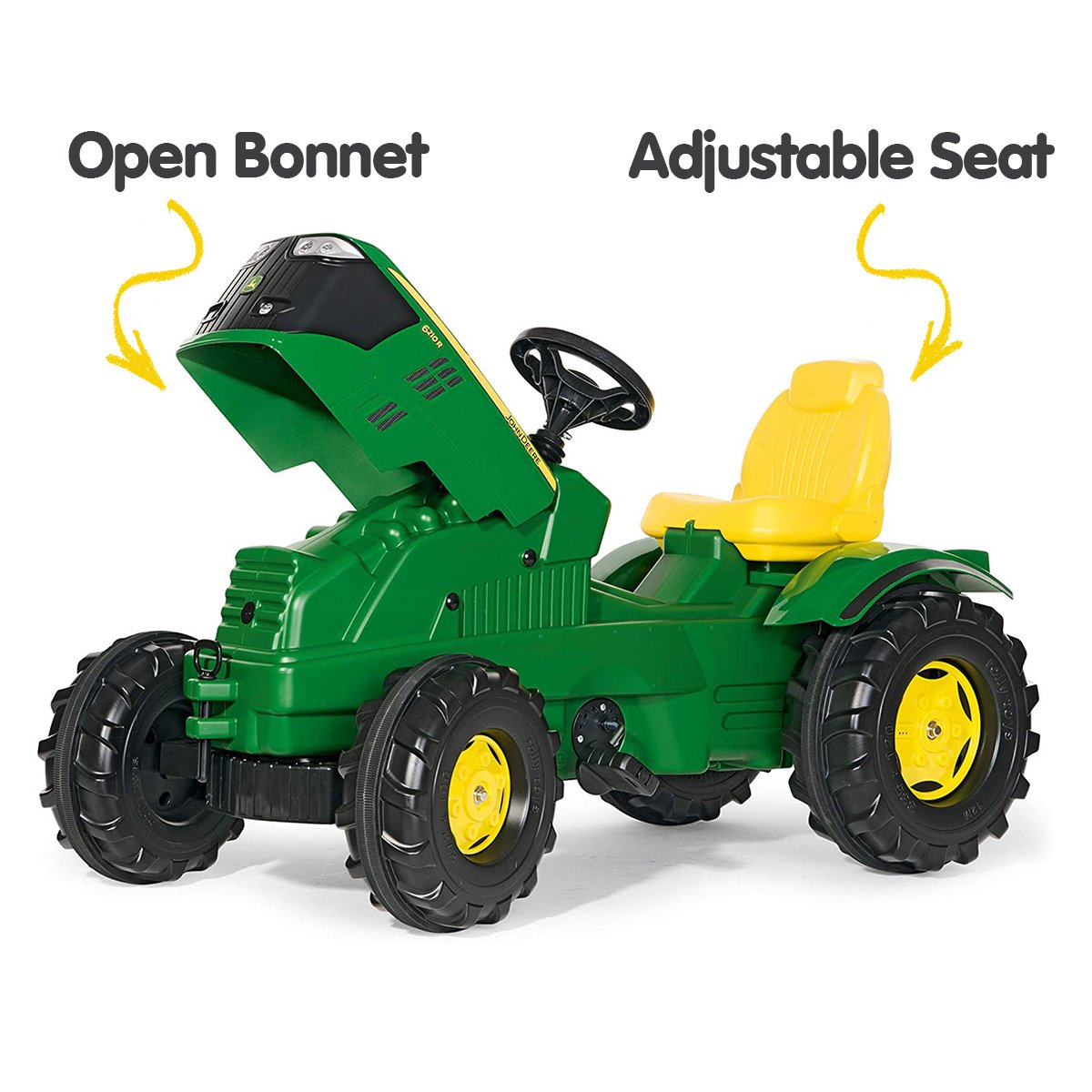 This extra-large chain-driven John Deere licensed tractor features anti-slip pedals, opening bonnet, front and rear hitch pins, extra-large rugged wheels and an adjustable seat.
