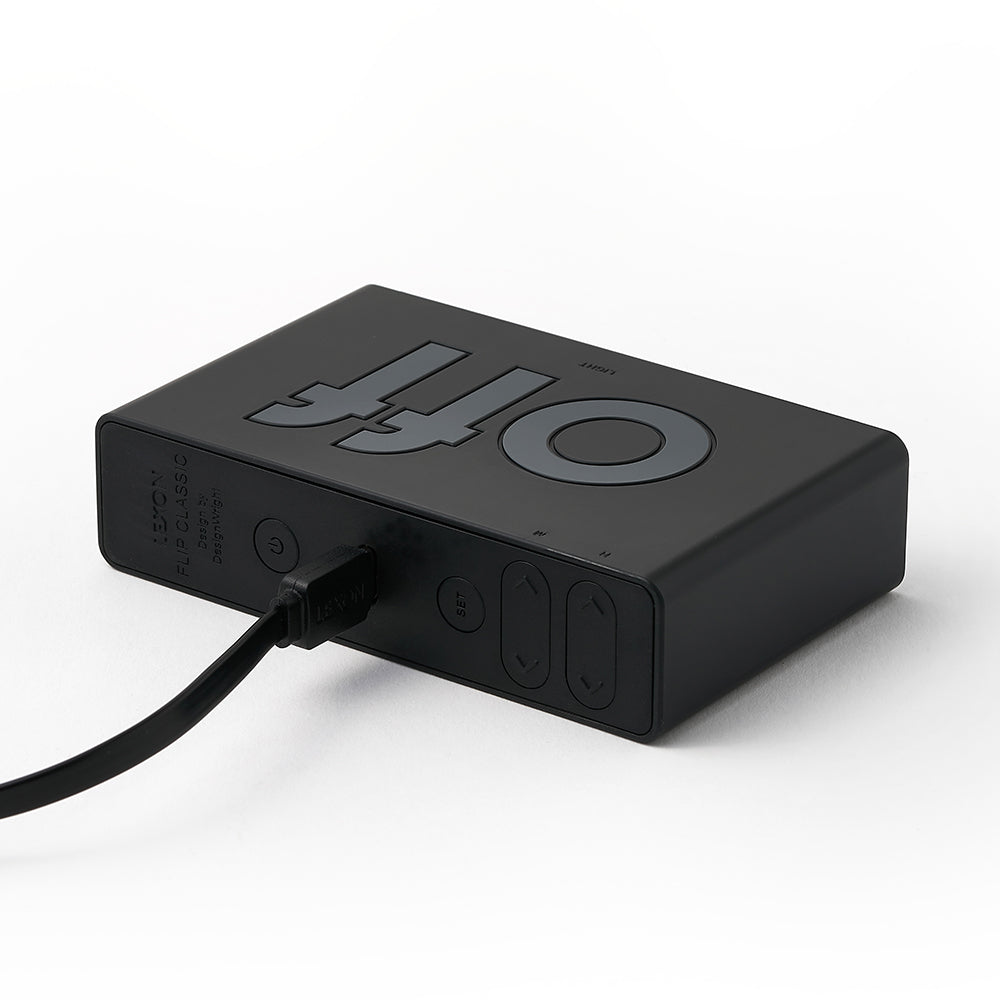 Lexon Flip Classic Reversible Alarm Clock - Black - Fun and equipped with two faces (ON / OFF), the alarm clock must be turned down to be activated or deactivated with a simple gesture. Thanks to its integrated touch control, you just have to touch it to trigger the light of its LCD display. In addition, Flip Classic features some discreet buttons on its back to set the time/date format, alarm and screen brightness. Designed to be your ultimate bedside companion, Flip Classic boasts a 6-month battery life, rechargeable via USB-C. A battery indicator is visible on screen so you’ll easily know when to recharge your device.