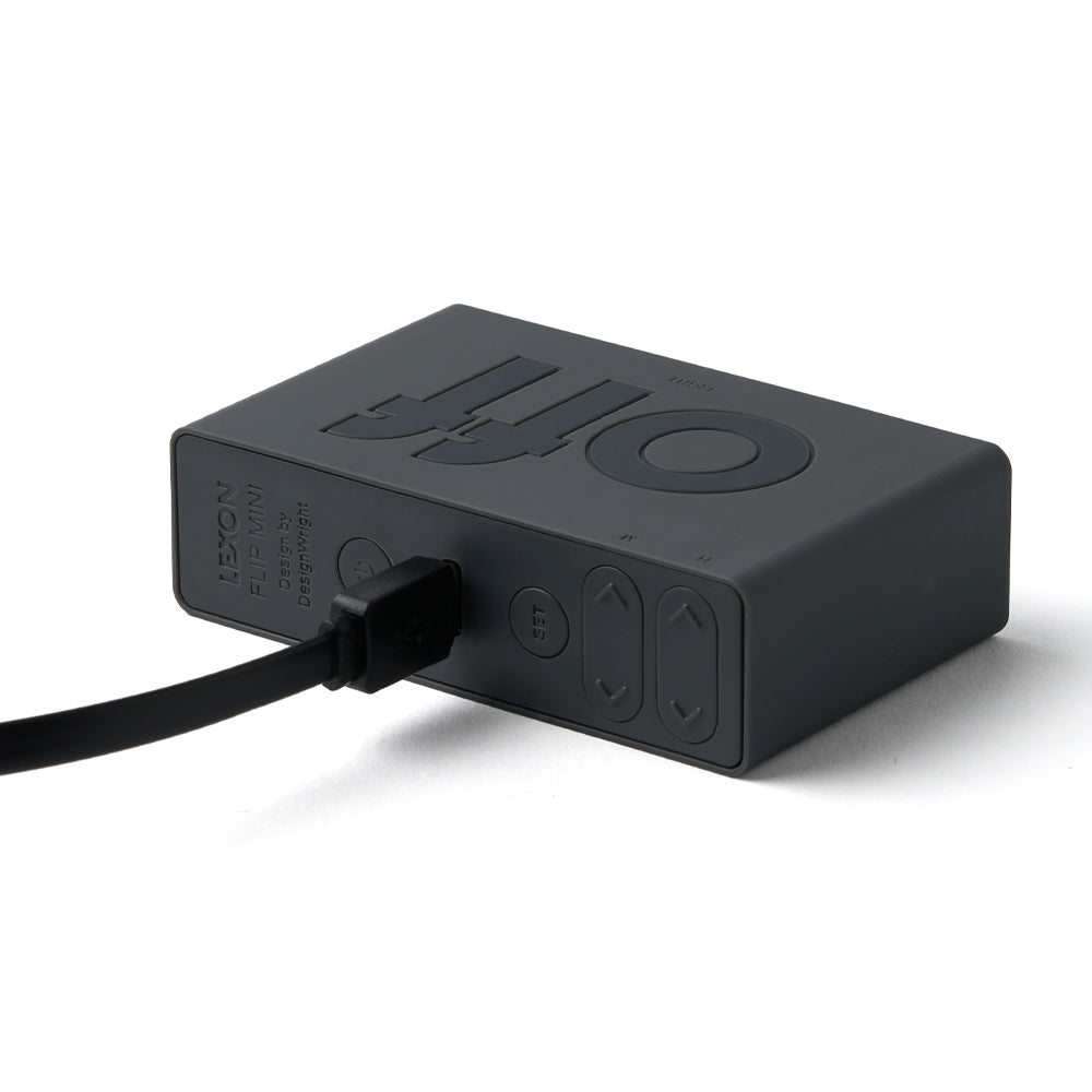 Lexon Flip Mini Reversible Alarm Clock - Grey - Our signature Flip alarm clock is also available in a smaller travel version that you can easily carry away. Fun and equipped with two faces (ON / OFF), the alarm clock must be turned down to be activated or deactivated with a simple gesture. Thanks to its integrated touch control, you just have to touch it to trigger the light of its display. Featuring a silicone rubber finishing that offers a soft touch and a compact size, Flip+ Travel allows you to upgrade your bedside discreetly. Available in several colors, Flip+ Travel is the must-have accessory to wake up with style.